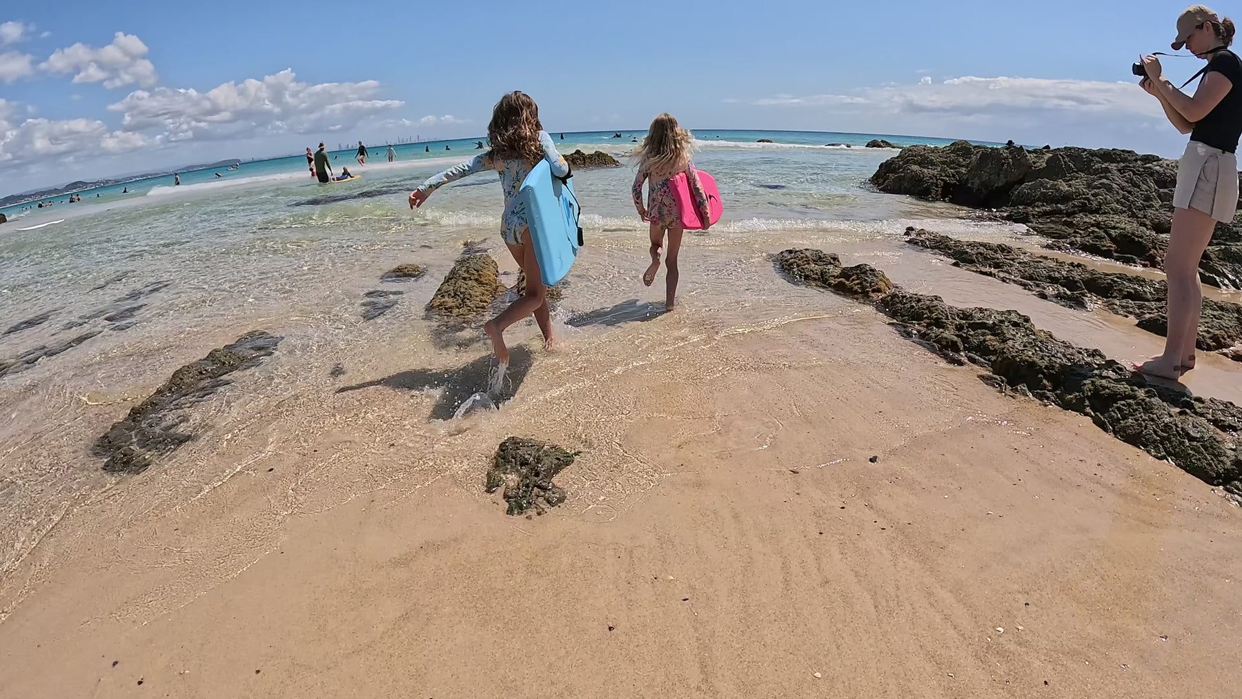 Two children running on a beach with bodyboards, one blue and one pink, under a clear blue sky.